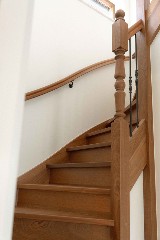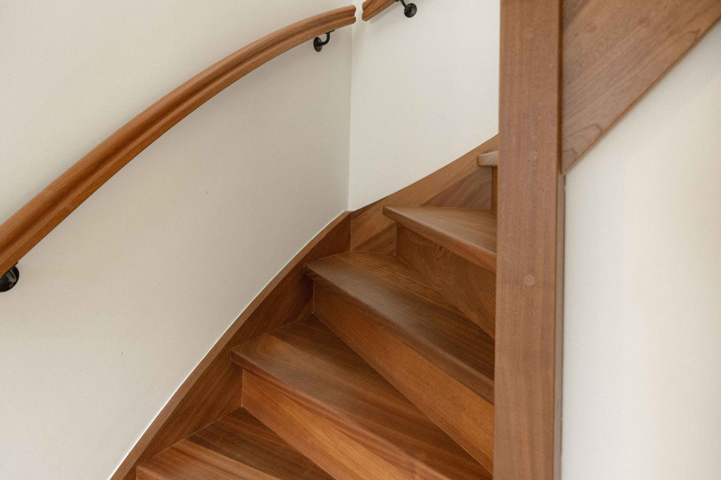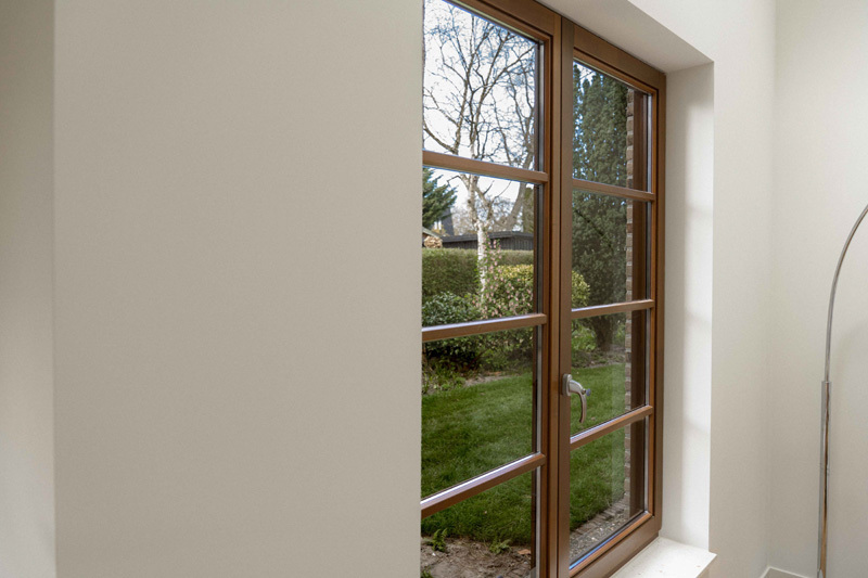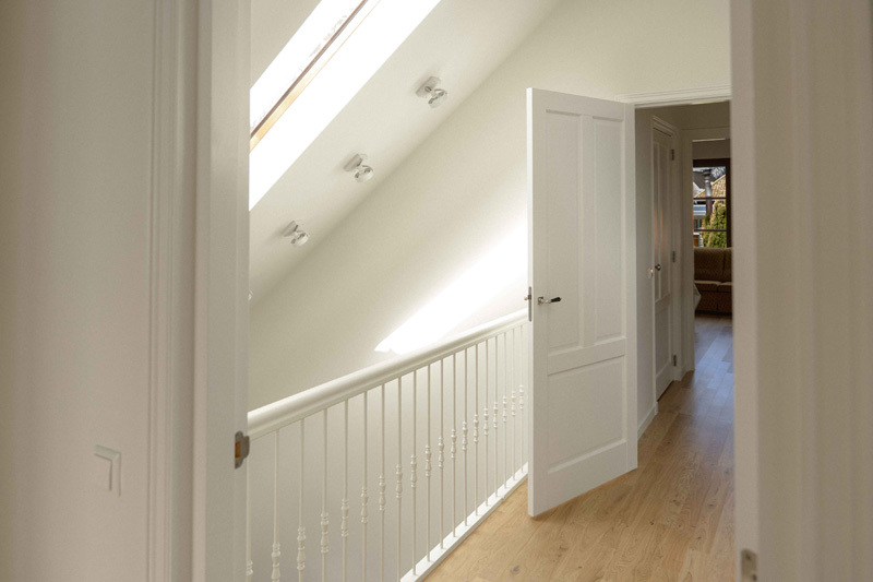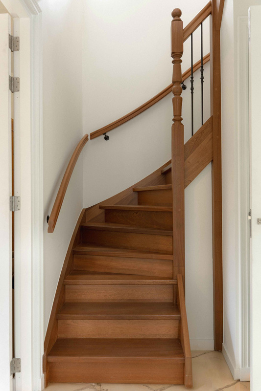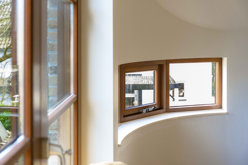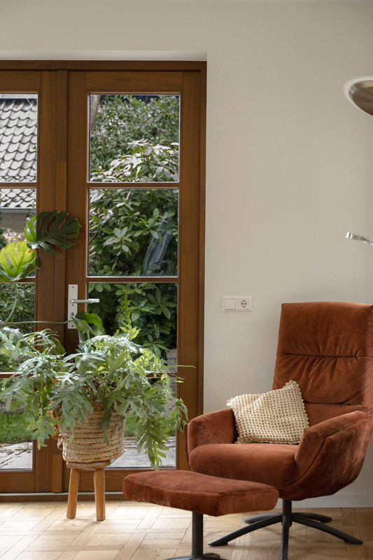 Het bestaande woonhuis voldeed niet meer aan de eisen van deze tijd en is na de sloop weer volledig opgebouwd in de sfeer van toen maar naar de maatstaven van nu (warmtepomp/isolatie en dubbel glas). Organische ronde vormen en kleuren die aansluiten bij de bosrijke omgeving. Bij deze verbouwing hebben we onder meer een op maat gemaakte trap, kozijnen en een fraaie ronding in de woning gerealiseerd. Stijlvol én creatief.